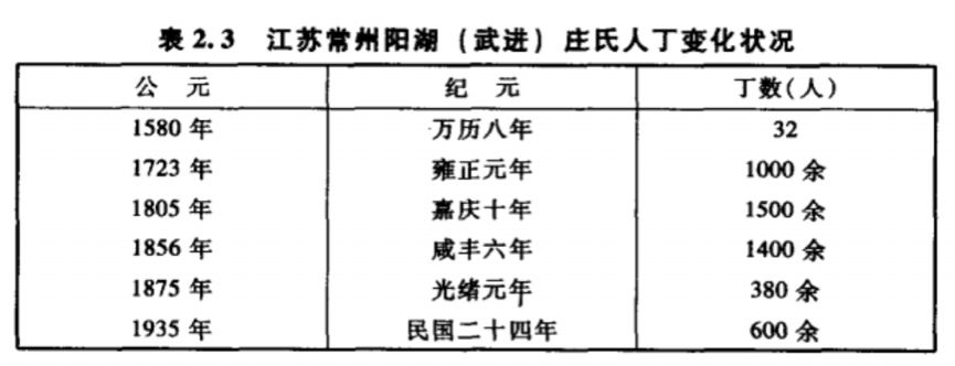 以江南一家庄姓宗族为例,其男丁人口在雍正以前的 143 年间以 2.436% 的高速度急增,随后转人年增 0.496% 的稳定低增长期达 82 年之久,直到嘉庆十年,开始了更低的 -0.135% 的负增长,再到咸丰六年后因天平天国战争而断崖式下降。