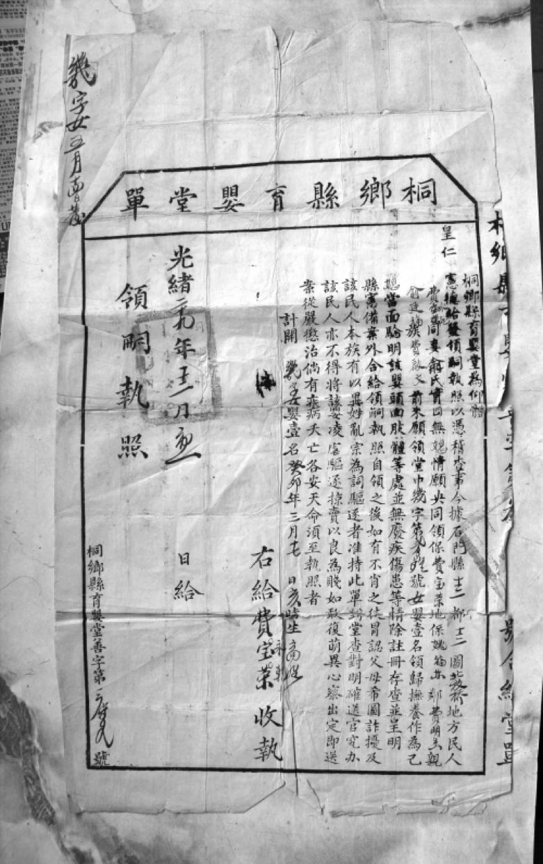 • 清光绪年间嘉兴桐乡的《桐乡县育婴堂单》,内容是某户家庭怕儿子以后讨不起老婆,从育婴堂领养一个被遗弃的女婴,养大后作为儿媳,即所谓「童养媳」