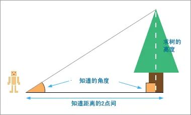 首先我们观察数根和树梢,得出两个观察方向,并且测量它们的夹角。然后我们再测量出观察点和树之间的水平距离,根据三角形的知识,就可以求出树的高度。