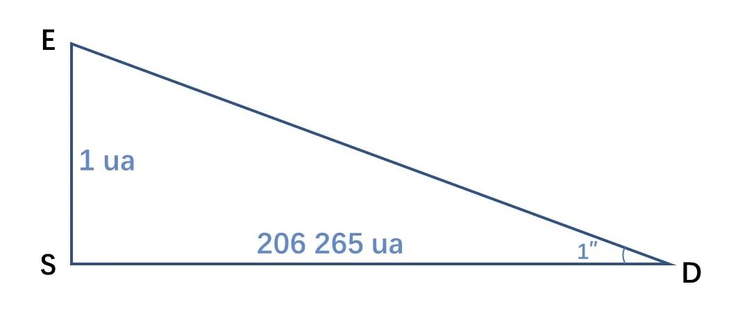 我们再把日地距离写作一个天文单位ua,把太阳(S)地球(E)和该天体(D)画成一个三角形,根据三角形的关系可以计算出地球和天体之间的距离SD为一个秒差距,大约是1pc=206265ua,也就是接近于20万个天文单位。