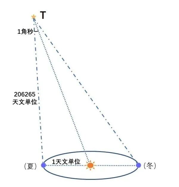 我们知道,一个圆周角为360度,每度又可以分为60角分,每分又可以分为60角秒,于是一角秒就等于1/1296000圆周,是一个非常小的角度。假如冬天和夏天观察同一颗恒星时,观测方向夹角为2角秒,那么恒星与地球的连线和恒星与太阳连线的夹角就约等于一角秒,此时我们就称恒星距离地球为一个秒差距(pc)。