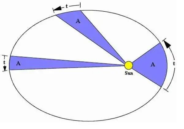 开普勒第二定律是说:如果把行星与太阳做连线,并且经过一段固定的时间,无论行星在何处,这个连线会扫过相等的面积。自然,为了保证面积相等,任何一个星球在近日点处速度都快一些,而在远日点处速度都慢一些。