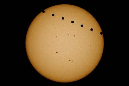 我们知道,金星轨道比地球轨道小,称为“内地行星”。有时候,金星会经过地球和太阳的连线,称为“金星凌日”,此时在地球上观察,金星像一个黑点一样扫过太阳。