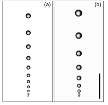 一个泡泡在上升过程中的大小变化的示意图,(a)(b)两图分别为啤酒和香槟中的气泡,黑线代表1毫米 图片来源:ACS Omega 2021, 6, 14, 9672–9679