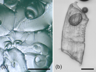 玻璃杯的显微照片,(a)(b)两图中黑线分别代表100微米和20微米 图片来源:ACS Omega2021, 6, 14, 9672–9679