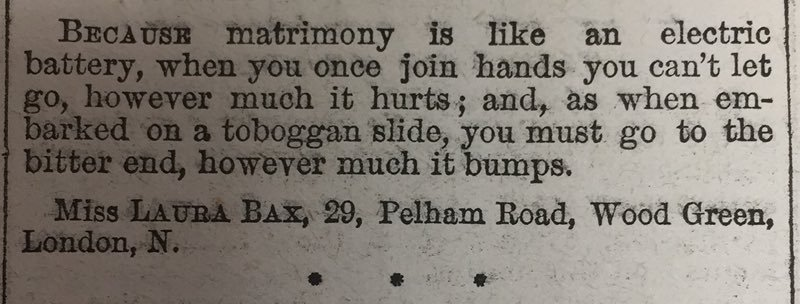 “婚姻就像一块电池(译者推测:这里说的是维多利亚时代十分流行的一种“医疗电池”盒,手握两侧棒状电极,据说通了电就撒不了手),不管多痛,牵了手就无法放手;也像滑雪橇,不管多颠簸,一旦开始就必须坚持到终点。”