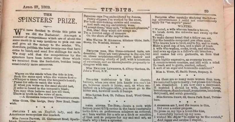 该编辑没法挑出一个赢家,所以他刊登了前21名的回复,把承诺的现金奖分成21份。每个女人可以获得5先令,约等于今天的25美元。
