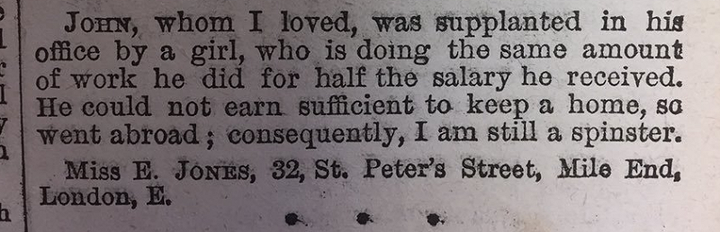 “约翰,我曾深爱的男人,他的工作被一个女孩取代,那个女孩做着和他一样的工作,却只得到他一半的薪水。他无法赚到足够的钱来维持一个家,所以去了国外;因此,我仍然单身。”
