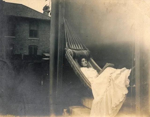 一个维多利亚时期的女孩在吊床上看报。© VINTAGE EVERYDAY