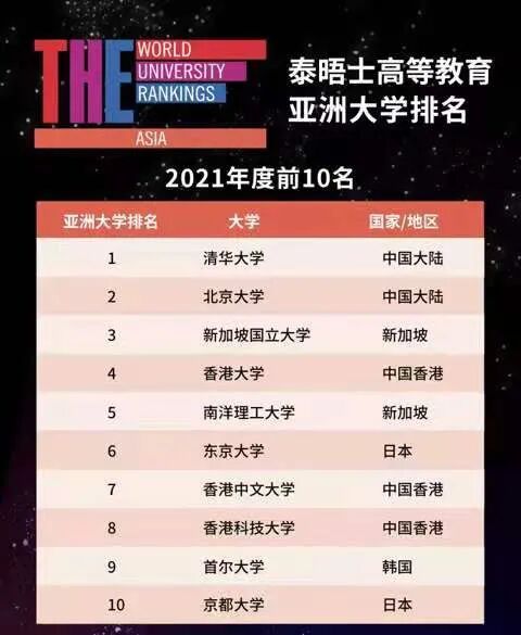 据新华社消息,英国泰晤士高等教育近日发布的2021年度亚洲大学排名显示,中国大陆31所高校跻身排行榜百强,其中清华和北大继续蝉联前两名。清华大学继2019年首次斩获榜首后,连续三年问鼎排行榜;北京大学也保持了第二名的位置,中国大陆高校连续两年占据了前两名。今年中国大陆共有15所高校跻身前50名,31所高校名列前100名。中国大陆共有91所大学进入榜单,仅次于日本的116所,创历史新高。中国香港共有6所大学入围榜单,其中香港大学、香港中文大学和香港科技大学跻身前十。此外中国澳门有2所大学上榜,中国台湾有38所大学入围。