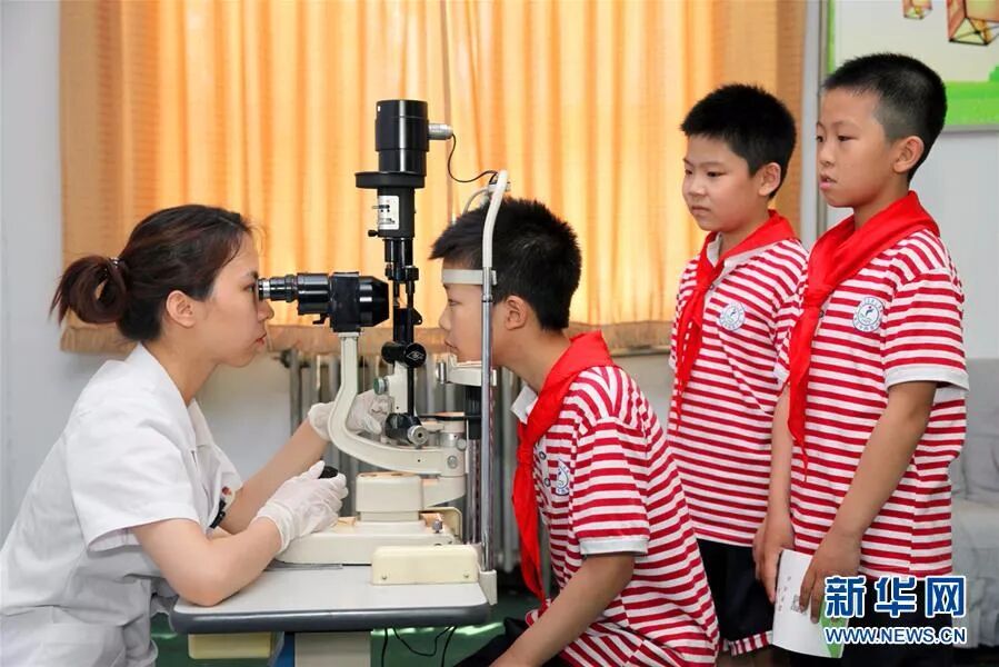 在石家庄市西里小学,医护人员为小学生进行视力检查(资料图)。图片来源:新华网