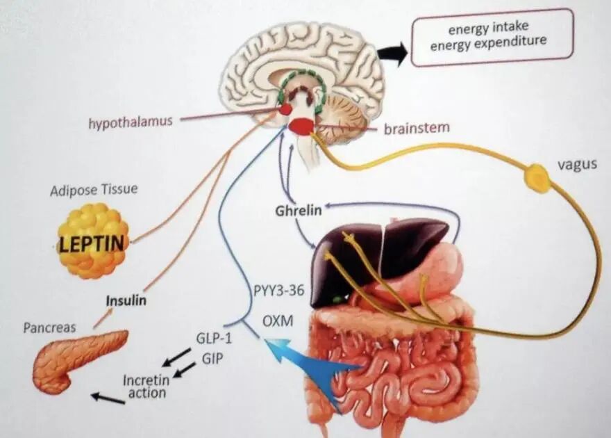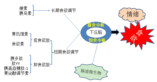 下丘脑是摄食调控的中心,围绕这个中心,人体的食欲调节有长期食欲调节和短期食欲调节,在这些调节过程中涉及到了多种激素。