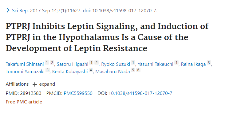 在瘦素无法正常起作用的过程中,有一种关键物质,叫做J型蛋白酪氨酸磷酸酶受体(protein tyrosine phosphatase receptor type J,PTPRJ),它通过抑制瘦素信号通路中一种酶的活化而使瘦素的抑食欲作用削弱或消失。