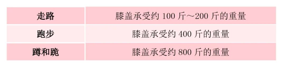 在常识中,大多数人会默认一点:走路比跑步对膝盖的冲击要小。事实也是如此,有实验数据为证:以一个体重100斤的人为例,走跑蹲的膝盖承重差别还是蛮大的: