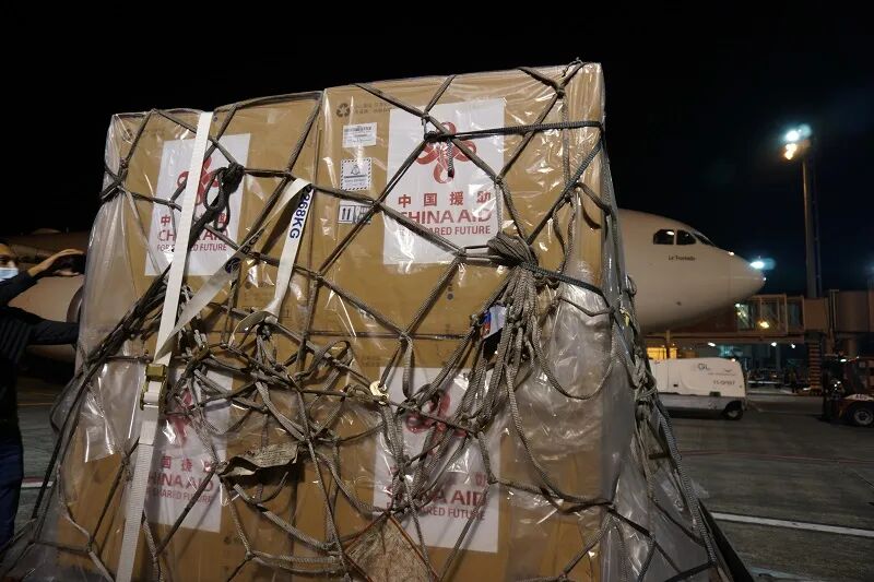 4月13日晚拍摄的运抵毛里求斯西沃萨古尔·拉姆古兰爵士国际机场的中国援助新冠疫苗。新华社发(中国驻毛里求斯使馆供图)