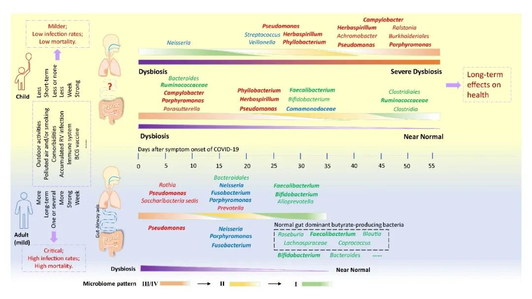 儿童和成人感染新冠肺炎期间上呼吸道和肠道菌群的演化示意图。(图片来源:云南生物资源保护与利用国家重点实验室)
