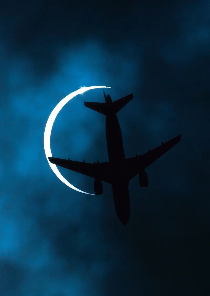 资料图。2020年6月21日,拉萨上空一架飞机飞过发生日食的太阳。新华社记者 普布扎西 摄