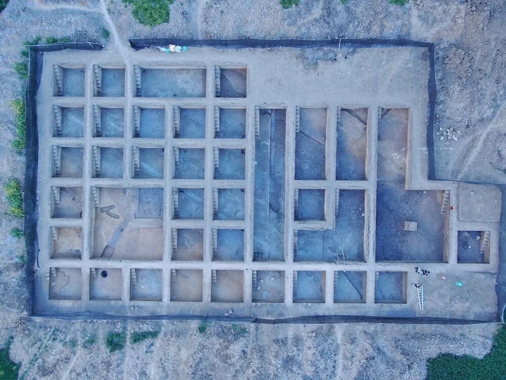 宝墩遗址发掘疑似水稻田层面航拍图。成都文物考古研究院供图