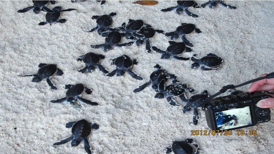 我问当地人你们在干嘛?当地人说:海龟是我们海洋的朋友,我们有很严格的海龟保护法,我们是从来不会捕捉海龟的,但是我们非常担心海龟上岸下的蛋被你们这些游客以及天敌给破坏了,所以呢我们每到海龟下蛋的季节,都会把蛋拿回家里,等待它孵化出小海龟之后,像指甲壳那么大的小海龟,再把它送回大海。