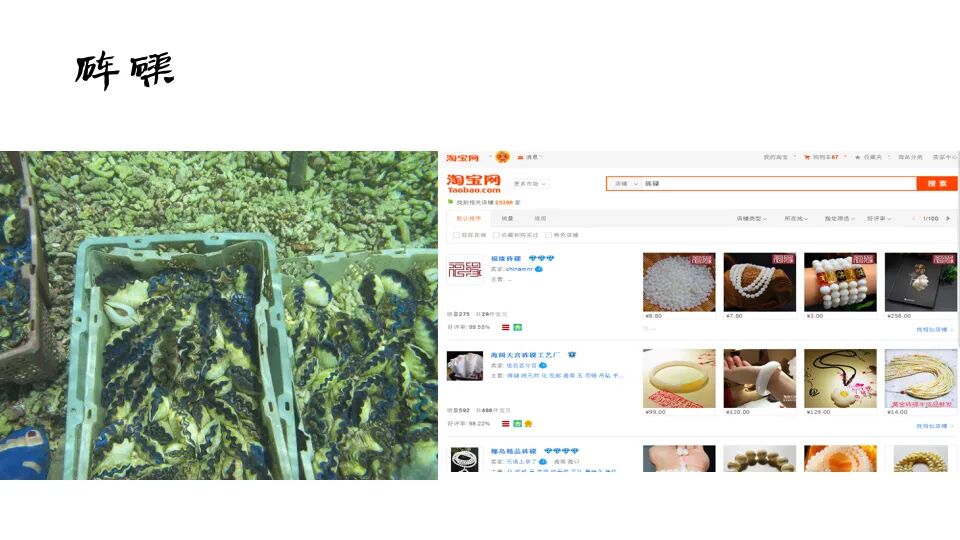 那么我们中国人很喜欢它的这种光泽,做起来像玉一样,颜色如象牙一样洁白。于是,我们的渔民就开始琢磨应该把它弄上来,继续卖给这个有巨大需求的消费市场,我们在淘宝上搜“砗磲”这两个字,出现的是25693家店铺在经营着砗磲饰品,这是很可怕的一个数据。砗磲也是列入了二类的保护,所以没有买卖就没有伤害。