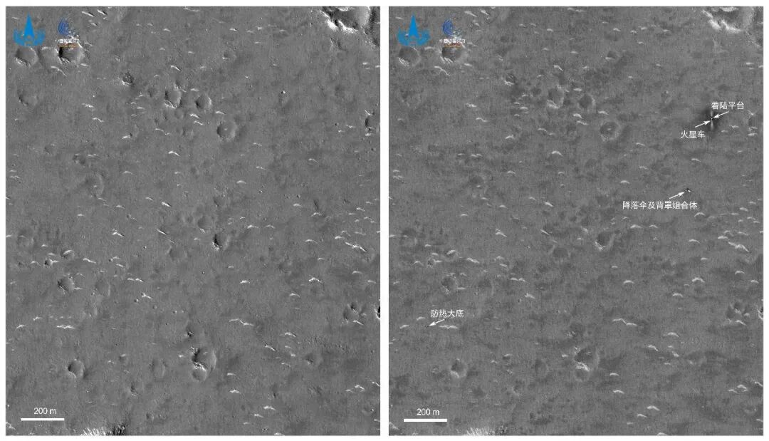天问一号传回的火星着陆区域高清图。左图为着陆前,右图为着陆后,可以看到天问一号的着陆平台和“祝融号”火星车。|国家航天局