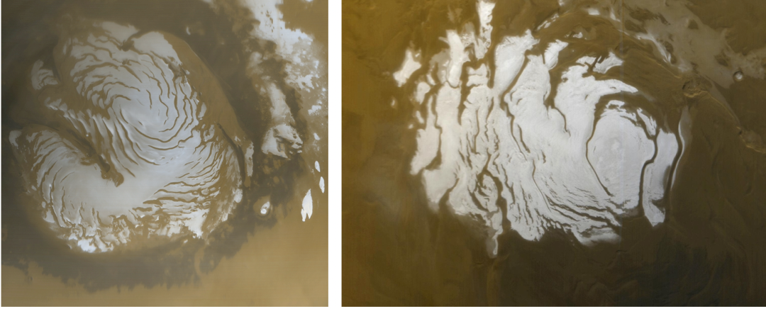 火星的南北两极覆盖有冰盖,由干冰和水冰混合而成。左图为夏天的火星北极,右图为火星南极。|NASA/JPL/MSSS