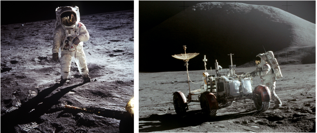 1969年,人类第一次踏上月球。左图为阿波罗11号宇航宇阿姆斯特朗拍摄的奥尔德林。右图为阿波罗15号宇航员在使用月球车。