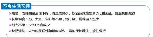 1.久坐不动;2.爱吃肉、高蛋白饮食;3.爱吃咸味零食;4.过度防晒;5.老年女性大量喝咖啡;6.大幅减轻体重(体重指数小于19);7.长期酗酒;8.爱喝碳酸饮料。