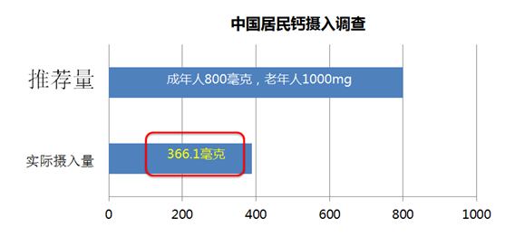 根据数据显示,我国城乡居民每标准人日钙摄入量为366.1毫克,不到推荐量的一半。