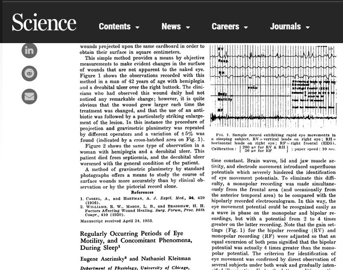 你是不是也一到午夜就无比精神? 甚至觉得如果有熬夜大赛,自己一定能得双料大满贯? 羡慕大家的“少年不知睡觉香”! 而有的人就不一样了,为了能好好睡一觉,住进了上海市精神卫生中心...... 这里不得不提起一段恐怖的视频,即所谓的“苏联睡眠剥夺实验”。 传闻二战时期,苏联为研究某种能使人保持清醒的气体展开“睡眠实验”。在此期间,5名犯人被关在食物充足的房间内,并向此房间内释放这种能使人保持清醒的气体。 中途,这项实验由于受试者情况糟糕而叫停,军方解救人员解救受试者时,受试者已经变成了没有神志的吃人怪物......(瑟瑟发抖) 事实上这个恐怖的睡眠剥夺实验已经被证实是假的。 那么,目前为止,有没有就睡眠展开的成功实验呢? 答案当然是:有。 01脑电波研究实验 要探究睡眠活动,有个绕不开的研究,那就是脑电波。 1924年,德国的精神学教授汉斯∙贝格尔(Hans Berger)首次对人类的脑电活动进行了测量和描述。 图片来源Study.com 贝格尔将2根针状的电极从头外伤患者的颅骨缺损处直接插入大脑皮层处,记录出了有规则的电活动。 图片来源Study.com 贝格尔还发现即使不把电极插入脑内,而是放置在头皮上,电极也能记录这种电活动。 他把正常人在安静闭目时主要出现在枕顶部的10Hz、振幅 50μV左右的规整波命名为α波。当受试者睁开眼睛注视物体时,α波消失,出现18-20Hz、20-30μV的波,命名为β波[1]。 贝格尔把上述的脑电活动记录下来,称为脑电图。有了脑电图,研究睡眠现象就多了一个考察指标。 贝格尔描述的脑电图,图片来源见水印 02快速动眼睡眠实验 1951年,尤金·阿瑟林斯基(Eugene Aserinsky)在8岁儿子的协助下进行脑电波检测实验。 长达数小时的监测后,脑电图机上的记录突然开始了不规则移动,也就是说孩子的大脑和眼部肌肉正处于兴奋状态,而事实上,孩子正处于熟睡状态。 这种情况在晚间睡眠中多次发生。他将这种奇怪的现象称为“快速眼球运动(REM,Rapid eye movement)”。 随后,阿瑟林斯基招募了20名正常的成年人到实验室。当这些志愿者进入睡眠并出现快速眼球运动现象时,将他们唤醒并询问他们,发现大部分志愿者此时正在做梦。1953年,这项发现正式发表。 此后,威廉·迪蒙特(William C. Dement)和纳撒尼尔·克莱特曼(Nathaniel Kleitman)将睡眠分为非快速眼动睡眠(NREM,Non-rapid eye movement sleep)的四个阶段和快速眼动睡眠。这揭开了睡眠研究的新篇章。 03地堡实验——研究生物钟 正是脑电波和快速动眼睡眠的发现为研究生物节律提供了研究基础,根据脑电波的变化,人们能轻易判断出受试者究竟是在清醒状态还是睡眠状态。 在此基础上,著名的睡眠研究员克莱特曼和他的学生在地下花费了1个月的时间来探索人体自然节律,这就是著名的地堡实验。 该实验1938年6月4日开始,至同年7月6日结束,共历时一个月。 克莱特曼和他的学生理查德为研究人体适应非24小时的循环能力,在肯塔基州找到了一个远古猛犸洞穴,该洞穴位于地下140英尺的地方,没有自然光照,温度维持在寒冷的54华氏度左右,因而无法为研究者提供昼夜变化的光照和温度线索。 研究者使用灯笼调节光线,并制定了睡觉9小时、工作10小时然后再休息10小时的28小时循环方案。这期间两位实验者睡眠时间错开,并相互检测体温,清醒时2小时检测一次,睡眠时4小时检测一次。 图片来源The Scientist,左克莱特曼,右理查德 试验期间,学生理查德仅仅用了大约一周时间就已经适应了28小时的作息规律,而克莱特曼则极难适应28小时的作息安排,更倾向于24小时的作息规律。在他体内似乎有一个不受外界环境干扰的生物钟在独立运行。且该研究发现人体体温睡眠时开始有所下降,清醒后又有所上升。 1962年,法国地质学家米歇尔·希夫(Michel Siffre)深入洞穴中进行勘察。在勘察时,他未带手表,以睡眠时间来推算他勘察的时间。离开时,他的记录本上共有36天的记录,因而当时的时间应该是8月20日,而真实的日期已经到了9月14日了。 为什么真实的时间比他记录的时间长呢?人的工作-睡眠周期难道不是24小时吗? 为了解决这个问题,希夫在美国德克萨斯州的一个洞穴中开始了他的第二次实验。这次,他最终在洞穴中度过了205天。 隔离期间,随着时间的推移,他的作息开始混乱,一觉睡15个小时,或者48小时的一天和平时普通的一天没什么两样。无聊的洞穴生活让他非常崩溃,而混乱的作息无形中加重了他的崩溃。 在没有其他因素干扰的情况下,原有的作息规律可能会被打破。 图片来源Cabinet 正常情况下,人类长期的自然生活所形成的睡眠-觉醒这一作息规律很难被更改。但这一规律也不是完全精准可靠的,在外界条件改变、人为干预的情况下这一周期的规律性可能会被打破。 那么,人可以长期不睡觉,将全部精力用来工作吗?最长可以连续多久不睡觉呢? 04睡眠剥夺实验 为了探究这些与睡眠有关的问题,研究者以某些动物为实验对象进行了睡眠剥夺实验。 目前最常用的几种睡眠剥夺试验方法有:平台睡眠剥夺技术、强迫运动睡眠剥夺法、轻柔刺激法、药物睡眠剥夺法和剥夺杆睡眠剥夺法。 图中使用的是平台睡眠剥夺技术,小鼠位于被水包围的平台,一旦入睡就会落水惊醒。 图片来源 Wikipedia 实验结果显示,睡眠剥夺会影响实验动物的生理功能和行为。 大鼠在完全睡眠剥夺后饮食、能量消耗量增加,代谢加快,