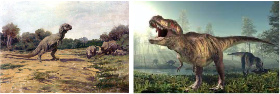 4月16日,发表在《科学》杂志上的一项研究估计,在霸王龙统治地球的两百多万年间,地球上曾经生活过约25亿只霸王龙。如果霸王龙是群居而非独居,数量可能更多。科学家曾认为霸王龙以笔直的三脚架步态站立(左);后来研究发现,霸王龙的步态是身体与地面接近平行(右)。|维基百科,the Conversation