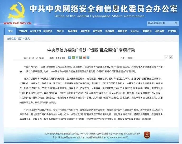 ●一段时间以来,“饭圈”粉丝群体在网上互撕谩骂、应援打榜、造谣攻击等问题屡见不鲜,破坏清朗网络生态,对未成年人身心健康造成不利影响,人民群众反映强烈。对此,中央网信办宣布15日起在全国范围内开展为期2个月的“清朗·‘饭圈’乱象整治”专项行动。(来源:新华社)