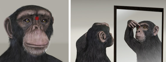 那要怎么知道动物认出了镜中的自己呢?在经典的镜子测试中,研究人员会先将动物麻醉,在它们身上做标记(标记的位置一般是动物正常状态下很少触碰的部位),然后等动物苏醒后让它们观察镜子中的自己,如果动物开始研究自己身上的标记,那不就说明它们意识到镜中看到的标记其实在自己身上了吗?图中,黑猩猩的眉脊被染上了清晰可见的红色染料。图片来源 Science盖洛普的试验就是这么做的,他找来与人类亲缘关系较近的黑猩猩,在黑猩猩的眉间染上红色印记(这个部位黑猩猩平时看不到),然后,分别观察黑猩猩在没有镜子的情况下以及有镜子的情况下,对记号部位的触碰情况。统计结果显示,与没有镜子相比,镜子存在时,黑猩猩触碰记号部位的次数明显增加(增加了400%-1000%)。研究人员观察到有些黑猩猩会用手指检触摸标记区域,然后嗅闻手指,似乎在试图研究记号到底是什么。这些行为表明,黑猩猩通过观察镜子中的影像,能够清楚地意识到染料存在于自己脸上,这就证明了它们具有自我意识(准确来说是视觉自我意识)。
