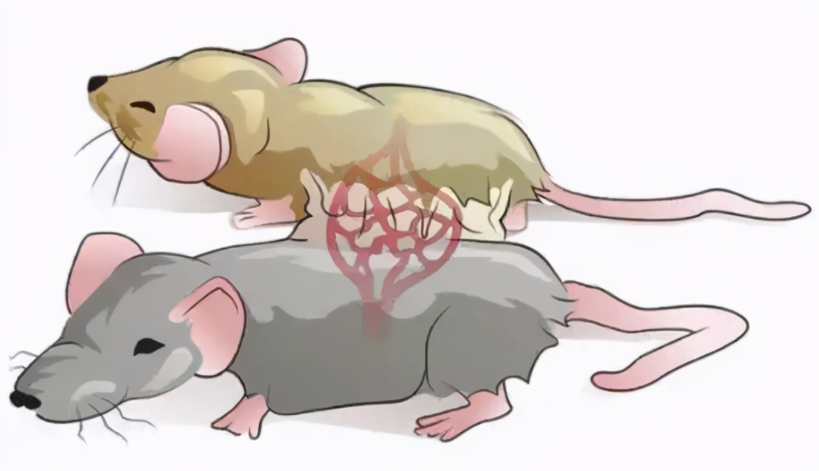 这一点是生物学中常见实验,就是联体鼠,熟悉我之前的文章的话,我介绍过一个联体小鼠实验,是把老年鼠和年轻鼠联在一起,然而他们血液共通,结果实现了老年鼠的返老还童问题。