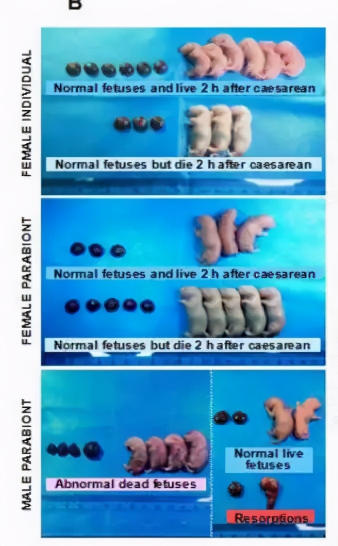 上图从上到下依次是正常雌鼠,联体雌鼠和联体雄鼠的分娩情况,其中每个图的上部分是2小时后活着的,下图部分是2小时候死去的,可见依然呈现很大差异。