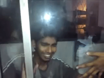 下面这个小伙死死地撑着门,原因是隔着门外,有人在拿着一只蟑螂在吓他。