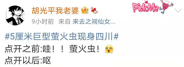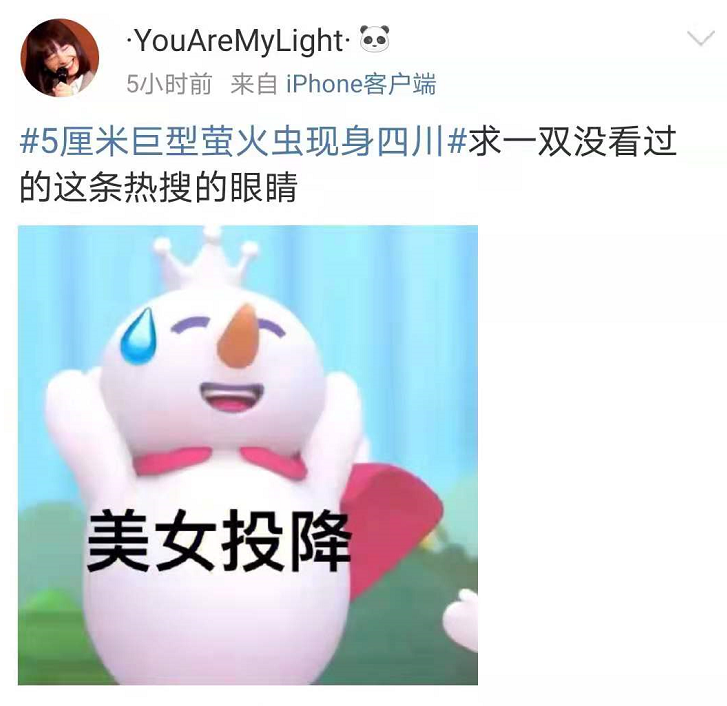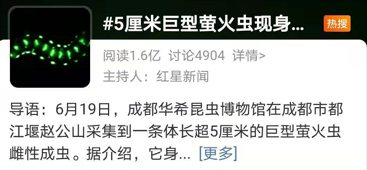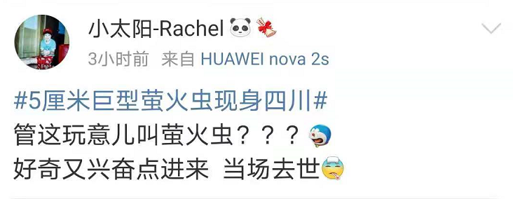 今天早上有条微博热搜“5cm巨型萤火虫现身四川”,点开之后,我发现很多微博网友的评论亮了,因为大家的评论都是这样的: