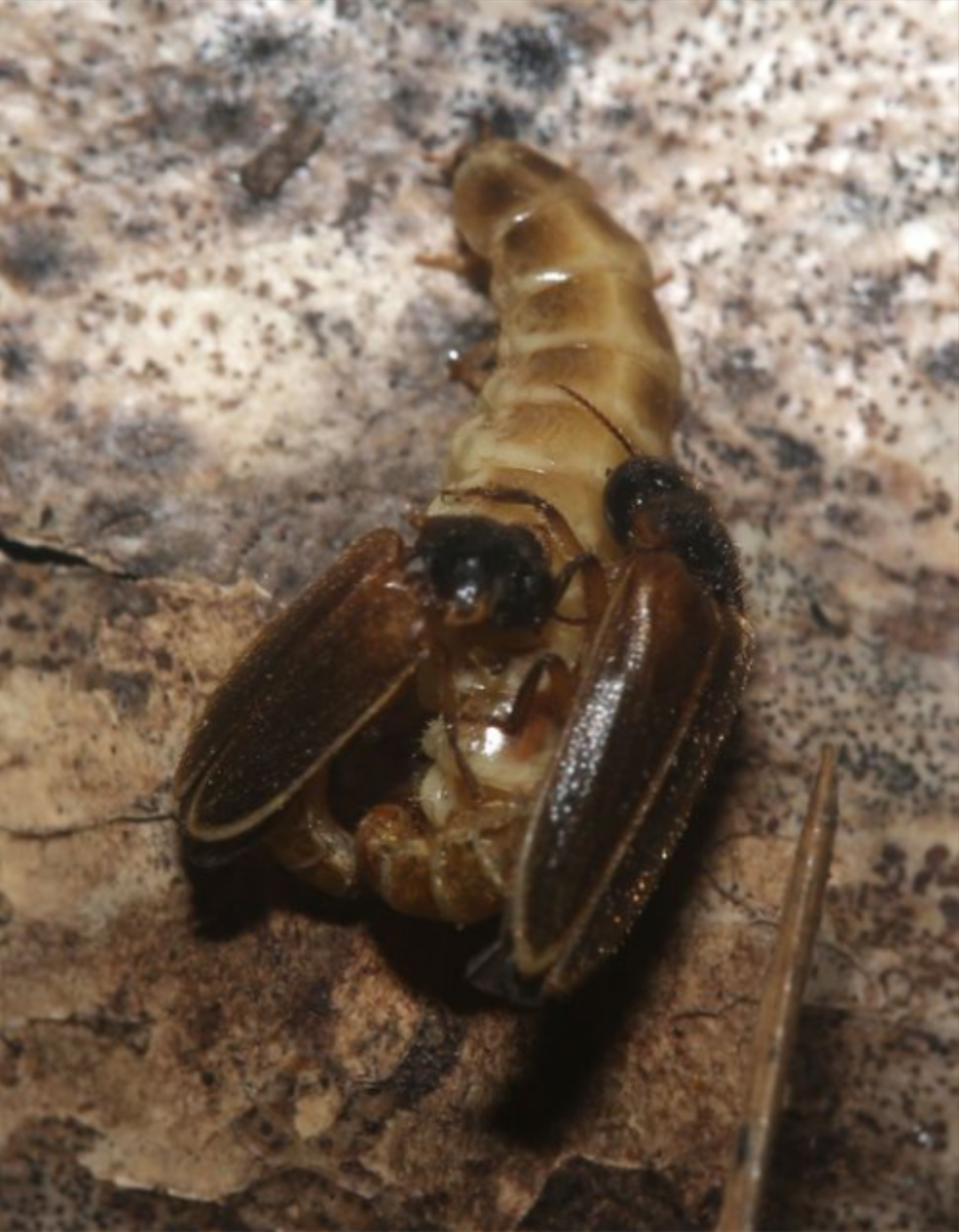 萤火虫会在化蛹前会先在泥土中挖洞造蛹室,之后经蜕皮后进入蛹期,可即便不吃不动,它也能发光自卫。