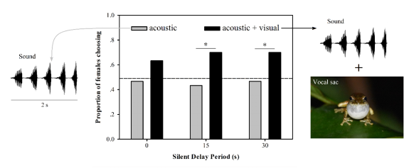 结果发现:在15 s或30 s的安静处理后,当两边播放相同的鸣叫时,与之前播放单模信号的一侧相比,雌性更喜欢之前播放多模信号的一侧。此外,雄蛙合唱鸣叫的平均间隔时长为27 s,与雌蛙对多模信号的工作记忆时长吻合,说明在大部分的合唱间歇期,雌蛙仍能记住多模信号。