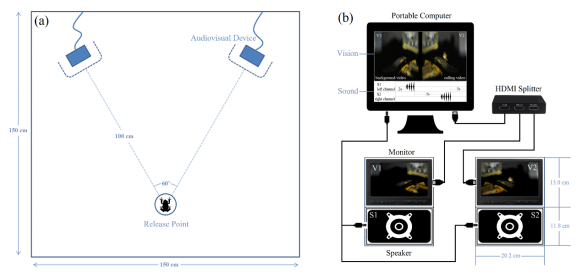图2. 视听多模信号回放实验场地示意图(a)和视听多模刺激播放系统(b)