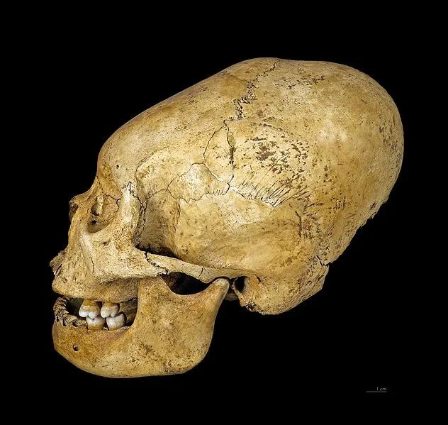 头骨的形状虽然奇怪,但我们可以确定这是人工产物,技术还被欧洲殖民者记录了下来。美洲的头骨塑形有两个流派,一个是板状塑形——用木板或其他东西来压缩婴儿的头骨。如果将一块平板放在孩子的头上,并将其绑好,就会使孩子的额头变平。如果孩子的头被放置在两个板之间,一个在前面,另一个在后面,再绑到一起,得到的将是横向变宽、纵向变长的头骨。