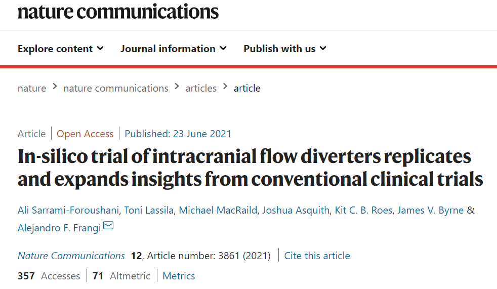 该研究以 “In-silico trial of intracranial flow diverters replicates and expands insights from conventional clinical trials” 为题,发表在最新一期的 Nature Communication 杂志上。英国利兹大学计算机学院生物医学计算成像和模拟技术中心 Ali Sarrami-Foroushani 教授为本研究第一作者,Alejandro F. Frangi 教授为本研究通讯作者。对于这一研究结果,负责此研究的 Frangi 教授表示,“我们的研究证实了计算机模拟人体试验的巨大潜力,通过计算机模拟人体临床试验不仅可以复现传统临床试验的结果,而且计算机模型的时间成本和资金成本都非常低。例如,传统的临床试验从设计到完成需要 5-8 年的时间,而计算机模型一般可以在不到 6 个月的时间内完成。”