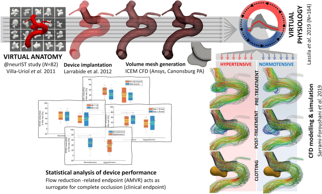 计算机模拟试验的出现,有望彻底改变临床实验的进行方式,减少开放新医疗设备和药物的时间及成本,并减少临床试验对人类和动物的伤害。虚拟患者群体的开发主要依据临床数据库,首先设定虚拟试验者的年龄、性别和种族,然后用数字模型模拟疾病对这些虚拟患者机体的影响,例如解剖学、物理学、生理学以及血液生化作用的影响,最后使用这些虚拟患者来进行试验,模拟治疗和干预措施的影响。为了验证虚拟患者进行临床试验是否有效,Frangi 教授选择利用模拟试验来评估分流器有效性,并调差模拟试验能否复制真实临床试验的结果。分流器是一种小型柔性网状管,医生一般通过导管将其引导至动脉瘤部位。一旦就位,分流器将沿着血管引导血液减少动脉瘤血流量,启动凝血过程,最终切断动脉瘤血液循环,从而治愈动脉瘤。为了证明虚拟模型的有效性,研究人员必须评估计算机模拟试验结果是否与之前三项经典的分流器有效性研究主要结果相一致。研究人员首先从临床数据库中提取了真实患者数据,构建了一个个虚拟的患者人群,确保虚拟患者在年龄、性别和动脉瘤特征方面与真实分流器临床试验中使用的患者非常相似。随后,研究人员利用计算机模型,分析分流器植入后如何影响虚拟患者的血流。通过分析每个患者的不同生理指标,例如血压等等,并对虚拟患者亚组进行分析。