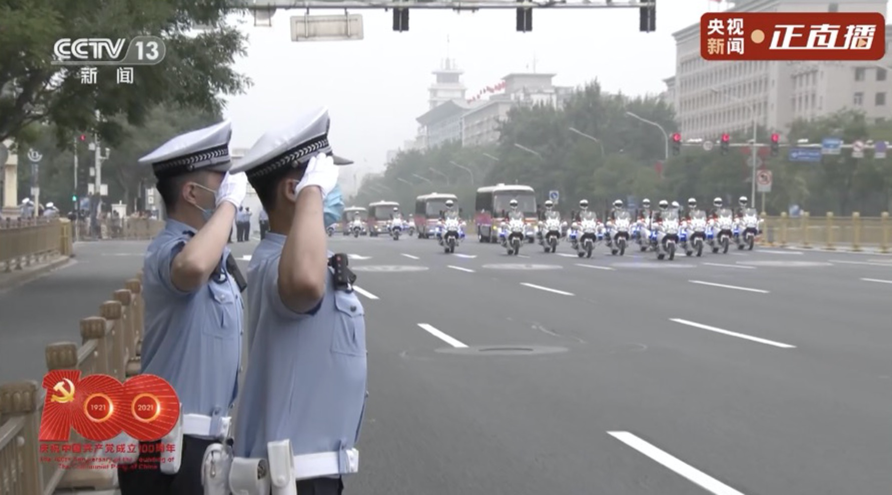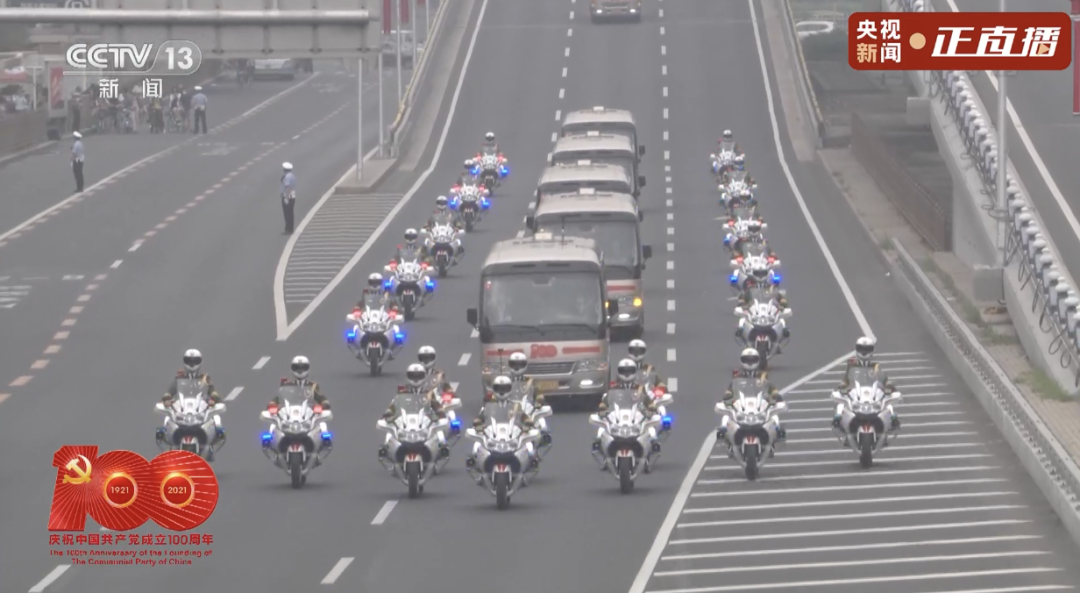 经中共中央批准 “七一勋章”颁授仪式 将于今天上午 在人民大会堂隆重举行 国家最高礼遇 国宾摩托车护卫队一路护送 上午8时许 由21辆摩托车组成的国宾护卫队 以国家最高礼遇 一路护送“七一勋章”获得者、 功勋党员 前往人民大会堂