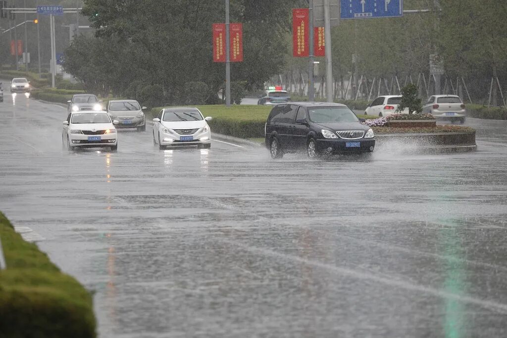 6月29日,山东济南迎来降雨天气,车辆涉水行驶。