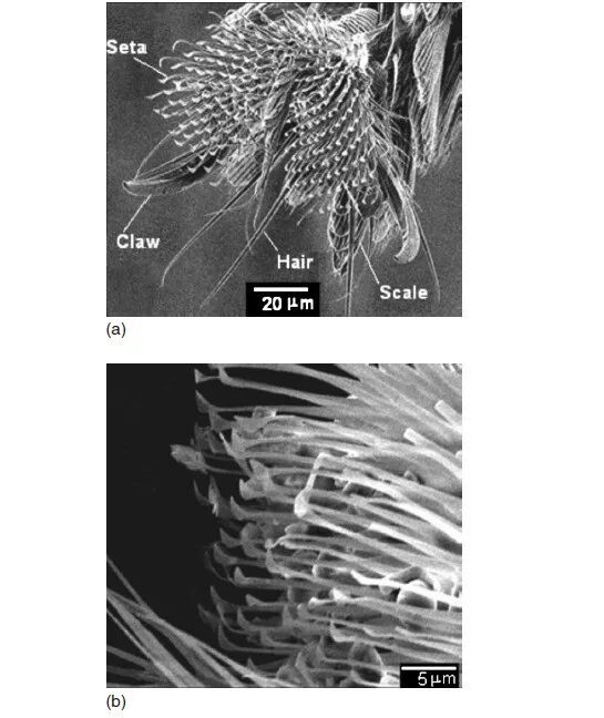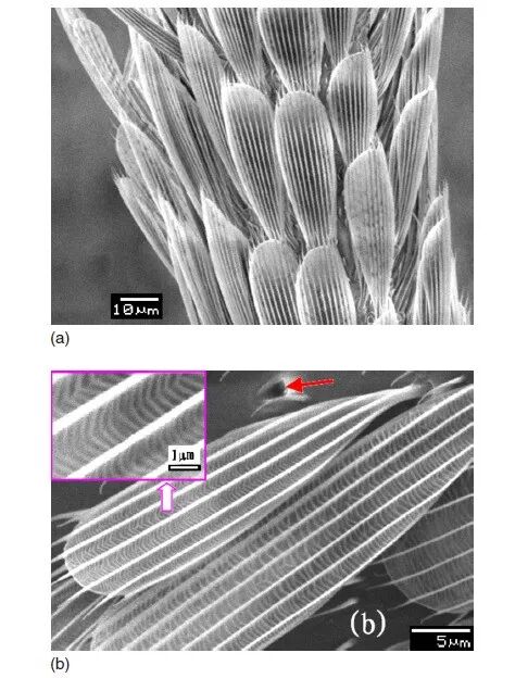 这些鳞片和蝴蝶翅膀的鳞片类似,像荷叶那样具有很强的疏水性。而且鳞片沟槽内的空气相当于给腿和水之间隔了层气垫,不给水打湿身体的机会。