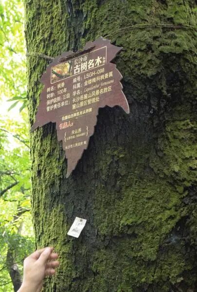 长沙岳麓山景区,工作人员在古树名木上放置装有赤眼蜂虫卵的白色纸袋