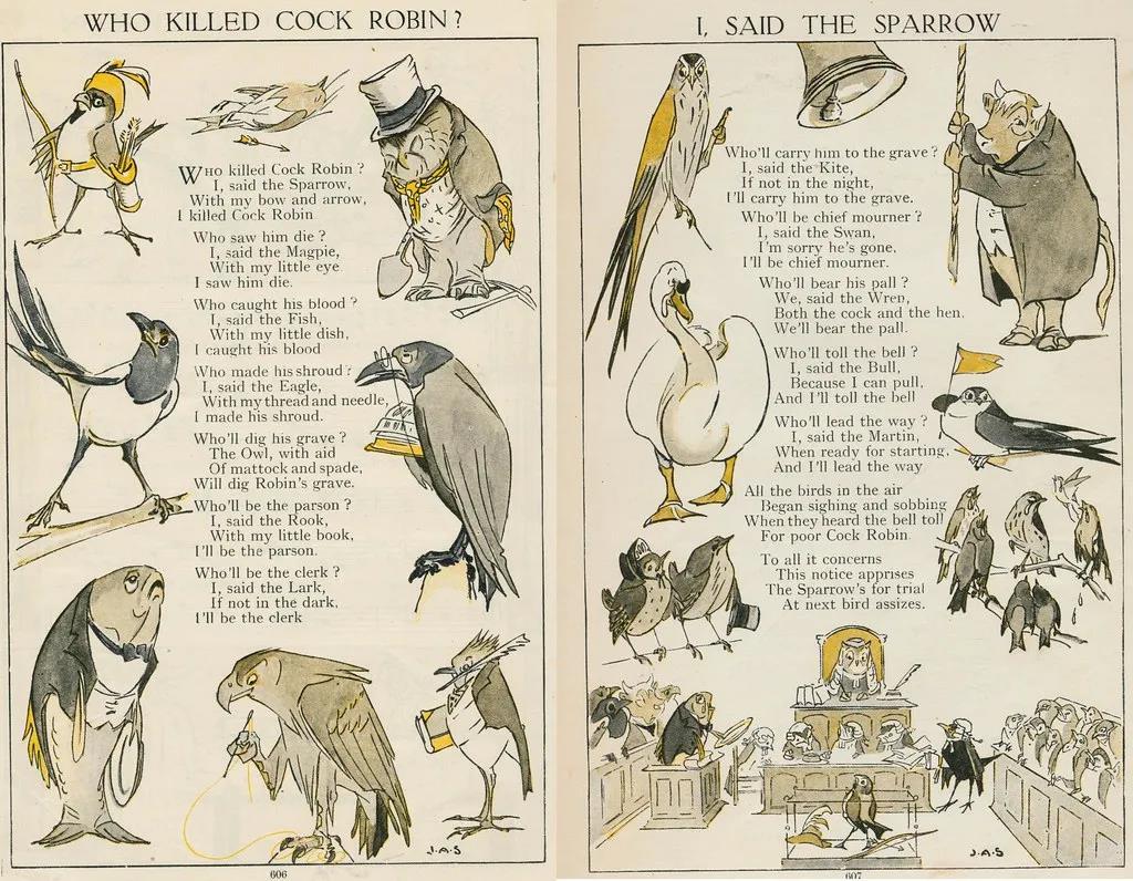 杀死一只知更鸟 摆放在妹妹案头的那本《谁杀死了知更鸟》(Who Killed Cock Robin,这里的cock指“雄性”)显然启发了他,这则英国童谣是后世文化领域里被广泛引用的谋杀原型,但童谣本身只局限于一个拟人化的场景——一场为死去的公知更鸟举行的葬礼。作为凶手的麻雀,为知更鸟掘坟的猫头鹰,主持葬礼的乌鸦,唱诵赞美诗的鸫(dōng)和扶棺的鹪(jiāo)鹩(liáo),这正是沃尔特苦苦追寻的将鸟类标本生动展现的方式。 《谁杀死了知更鸟》,来自Childrens Enceclopedia Rhimes一书 | janwillemsen / Flickr 在此后的七年里,沃尔特不断搜寻乡野间的鸟类尸体,将它们做成标本陈列在这场宏大剧目中,1861年的夏天,由98只鸟类标本组成的“公知更鸟的死亡与葬礼”终于得以面世,被它吸引而来的游客之多远超沃尔特的预估,以至于酒吧必须单独辟出一座厢房专供展览之用。 自此之后,沃尔特的标本制作便全面转向拟人化、场景化的独特风格,他不断增加的作品也迫使展览场馆不断更换,到1880年时,沃尔特•波特私人博物馆已经成为布兰伯的新地标,在潮湿幽暗又弥散着异味的博物馆里洞察新奇世界,成了那一代英国孩童的共同记忆,以至于布兰伯的火车站都不得不因此特意扩建。 脾气暴躁的硬核小鸟 沃尔特博物馆的意外火爆并非无迹可寻,他的成名作原本就有极为广泛的“群众基础”,如同中国人对仙鹤、家燕的喜爱,知更鸟——欧亚鸲(qú)在英国文化中的地位也足够超然出众。这种小小鸣禽是英国乡村最鲜明的代表,每当园丁和农夫翻土耕地时,知更鸟就会飞来啄食昆虫,这让它早早收获了“益鸟”的名号。 欧亚鸲 | Pixabay 中世纪的英国传说还试图将知更鸟胸前的橙红色羽毛与圣人联系起来,有的民间故事描绘到,当耶稣被钉上十字架时,是知更鸟飞到他耳畔鸣唱以减轻他的痛苦,也正是在此时耶稣的鲜血浸染了鸟胸前的羽毛。《谁杀死了知更鸟》这则童谣也是基于同样的逻辑,将胸前透出血色的鸟作为神话或历史人物死去的隐喻,简单故事背后的深刻内涵,恐怕也是这则童谣得以流传千百年的奥妙。 欧亚鸲 | Pixabay 奇怪的是,知更鸟并非英国独有,在整个欧洲地区乃至北非沿海地带,人们都不难发现知更鸟的身影,但为何只有英国孕育出对知更鸟的强烈崇拜?以至于在漫长的殖民时代里,英国人每到一地,都要将当地的某种鸟类命名为“知更鸟”(如美洲的旅鸫)以解思乡之情? 旅鸫,被称为“美洲的知更鸟”(American robin) | Pixabay 这或许和知更鸟的领地意识不无关系。作为一种外形乖巧的小鸟,知更鸟保护领土却极具侵略性,它们时常猛烈进攻进入其领地的其他鸟类,在一些昆虫资源贫瘠的地区,因同类争斗而亡是雄性知更鸟死亡的第一大主因,这恰好迎合了潜藏在英国人思想深处的小岛心态。 猎奇展览会 沃尔特的博物馆中并非只有这一组“镇馆之宝”,他晚年制作的小猫婚礼派对、兔子课堂,以及由周边村民赠送的畸形猫咪、双头绵羊制作的标本也备受欢迎。这似乎说明,博物馆的火爆也并非完全仰仗知更鸟的人缘。 这其实也很好理解,人和自然的互动,在历史长河中持续不断的演进,这些或拟人化,或畸形的标本,正好迎合了维多利亚时期人们对自然万物的猎奇心态。而从最初的将自然视为单纯资源加以利用,到沃尔特时代的猎奇审美。 瑞士Estavayer青蛙博物馆,呈现了摆放成各种姿势的青蛙标本 | Rama / Wikimedia Commons 时至今日,人们已经开始学着欣赏自然万物的原始美感,从上世纪中期开始,沃尔特博物馆的经营愈发困难,而放眼全球,动物马戏、海洋馆表演的逐渐退场,也是体现了这种审美情趣的变化。这无疑是一个乐观的发展,或许在不远的未来,我们的孩子,就可以免去奔波博物馆的辛苦,只要凝视四周,便可以观察一个更广阔,更美好,更勃勃生机的世界。