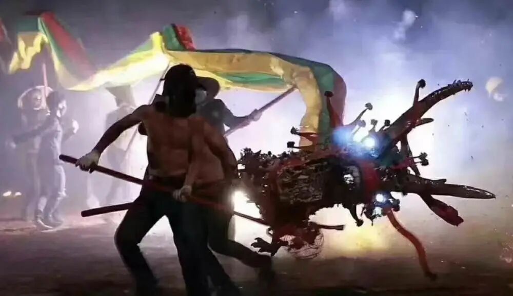 虽然看似混乱,但整个过程是十分严谨的,每条龙的前方都有手持火把的火药手为龙头引路,并且负责帮龙喷火的工作。