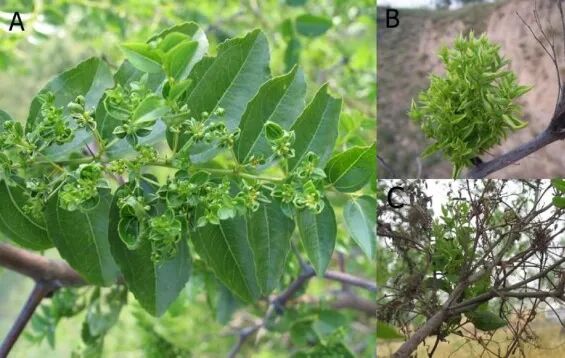 枣疯病可以造成花器退化返祖,有些病株萼片、花瓣、雄蕊发育成小叶,呈花变叶状;有些病株萼片、花瓣变为绿色,雄蕊和雌蕊败育,呈绿瓣状。